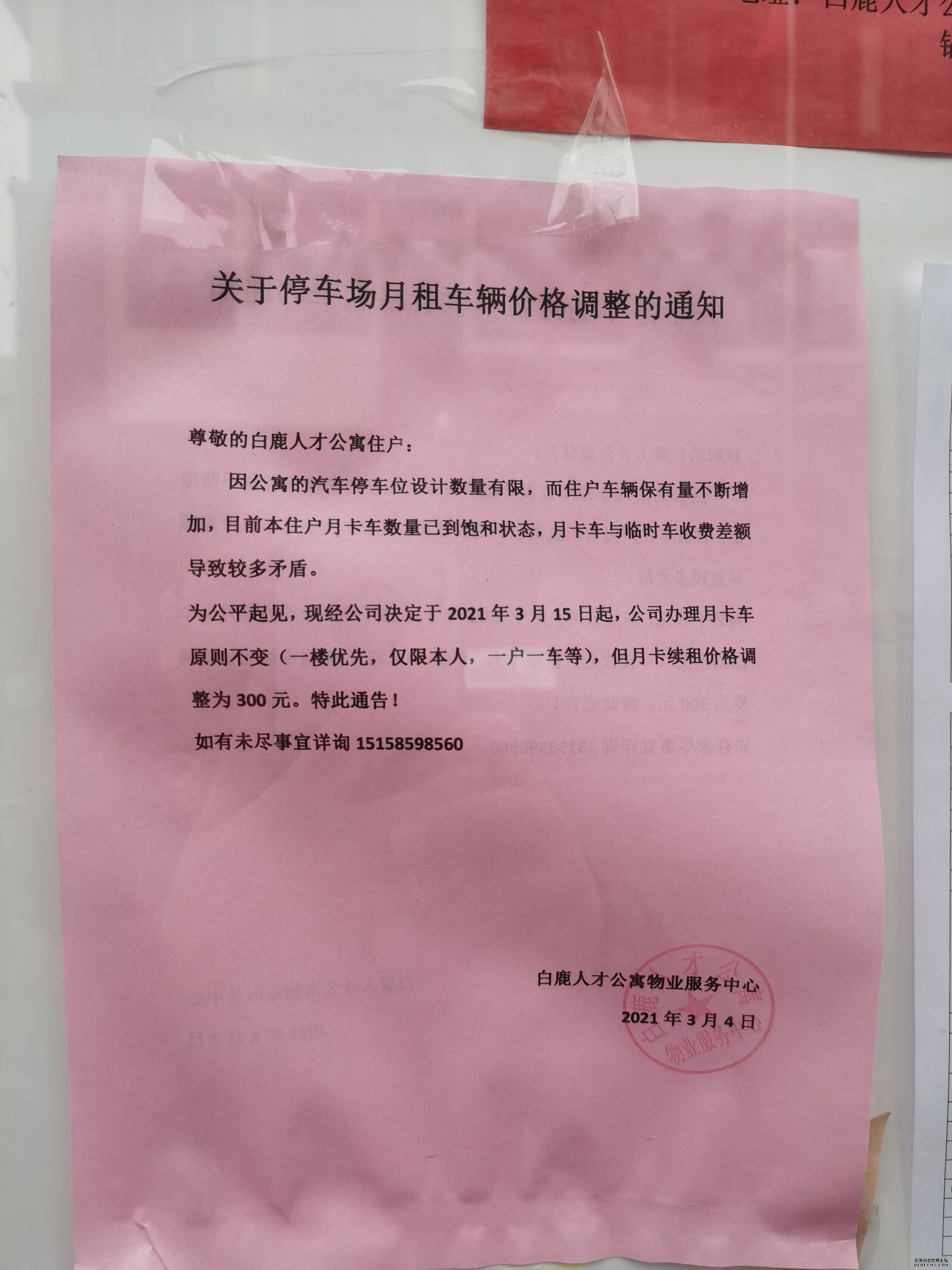 尊敬的黄先生您好,编号WX20210271230605的信访件已收悉,经集团调查现将情况反馈如下: 浙江博美物业服务有限公司温州分公司未经我集团同意,拟将停车费提高到300元/月,已违反《白鹿人才公寓运营及物业管理合同》约定。现我集团已责令浙江博美物业服务有限公司温州分公司整改,要求按照合同约定价格收费。