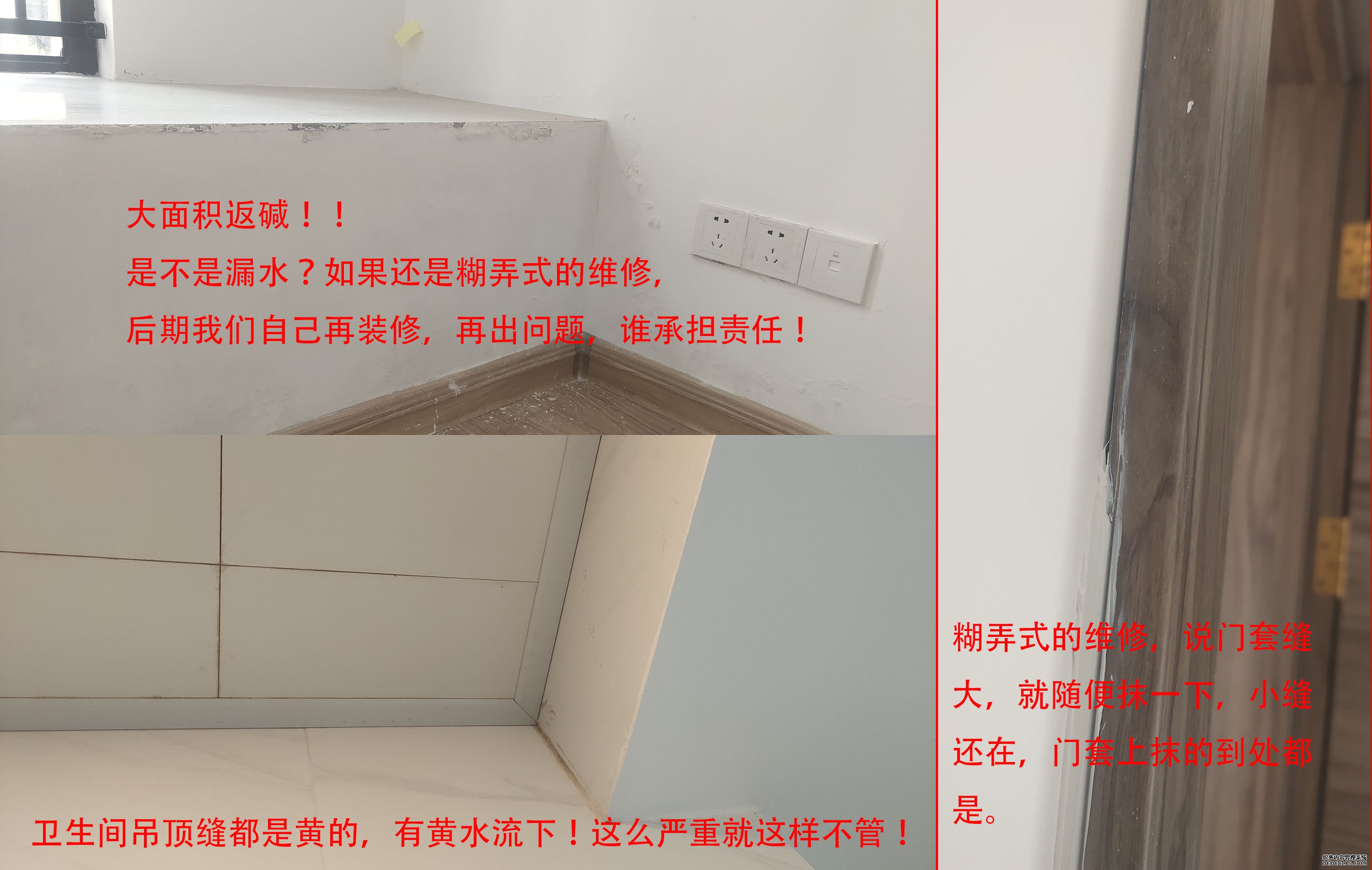 20号交付,我们看了一上午,就找出近30处问题。各种地不平、墙不平、瓷砖不平、返碱、缝隙大、吊顶漏水……。过了一周再去看,很多问题还在,处理了的也是糊弄式的维修!这些装修问题,还都普遍存在!